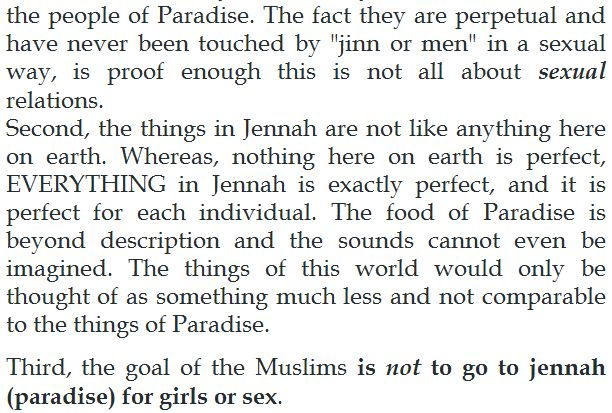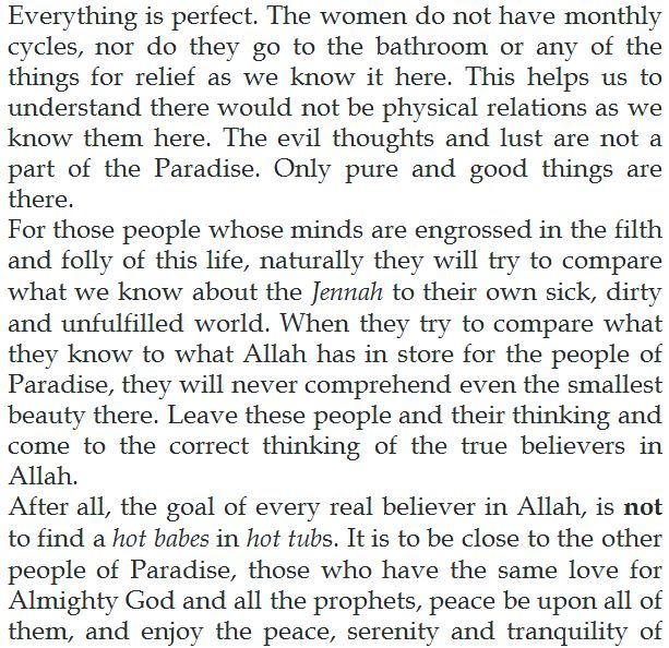 After all, the goal of every real believer in Allah, is not to find a hot babes [sic] in hot tubs. It is to be close to the other people of Paradise, those who have the same love for Almighty God and all the prophets… (screenshot)