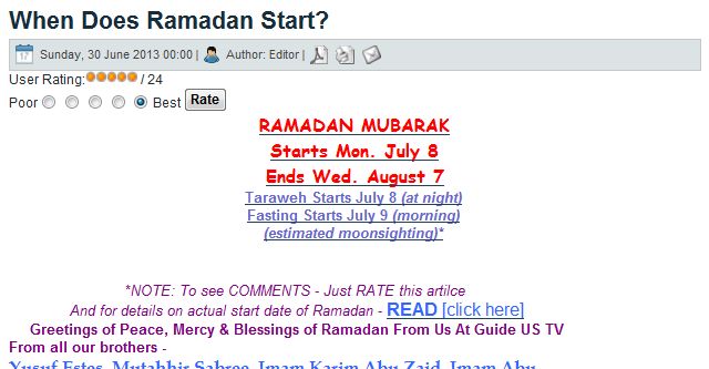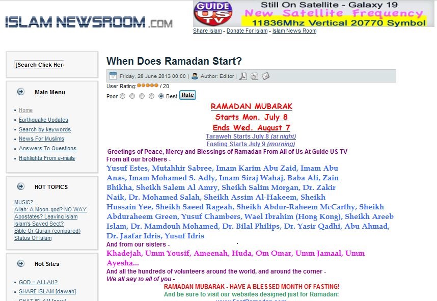 In another clear violation of basic Muslim practices agreed upon by the Muslim scholars throughout history, controversial American preacher Yusuf Estes’ website “Islam NewsRoom” announced yesterday that the fast of Ramadhan will begin on July 9, conveying Ramadhan greetings from their “GuideUS TV” team, featuring the following individuals (as if they have all agreed to this):
