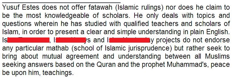 Just today, Yusuf Estes publishes a disclaimer after another one of his religious verdicts on the “IslamNewsRoom” website, which includes the following:
