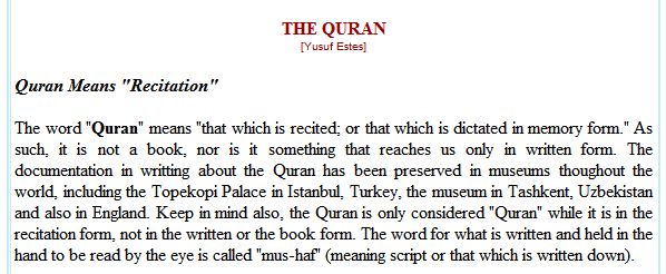 As found on his website, IslamTomorrow, Yusuf Estes clearly rejects the Quran being in book form. He refers to the mus-haf as the documentation in writing about the Quran. These are not the beliefs of the Muslims in any way.